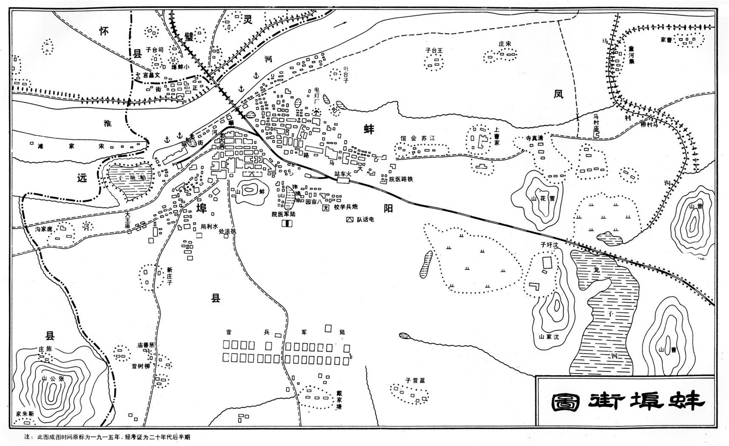 此《蚌埠街图》标注为1915年的安徽省蚌埠市街及周边区域地图,比例尺及出版机构未知,未知更多信息。