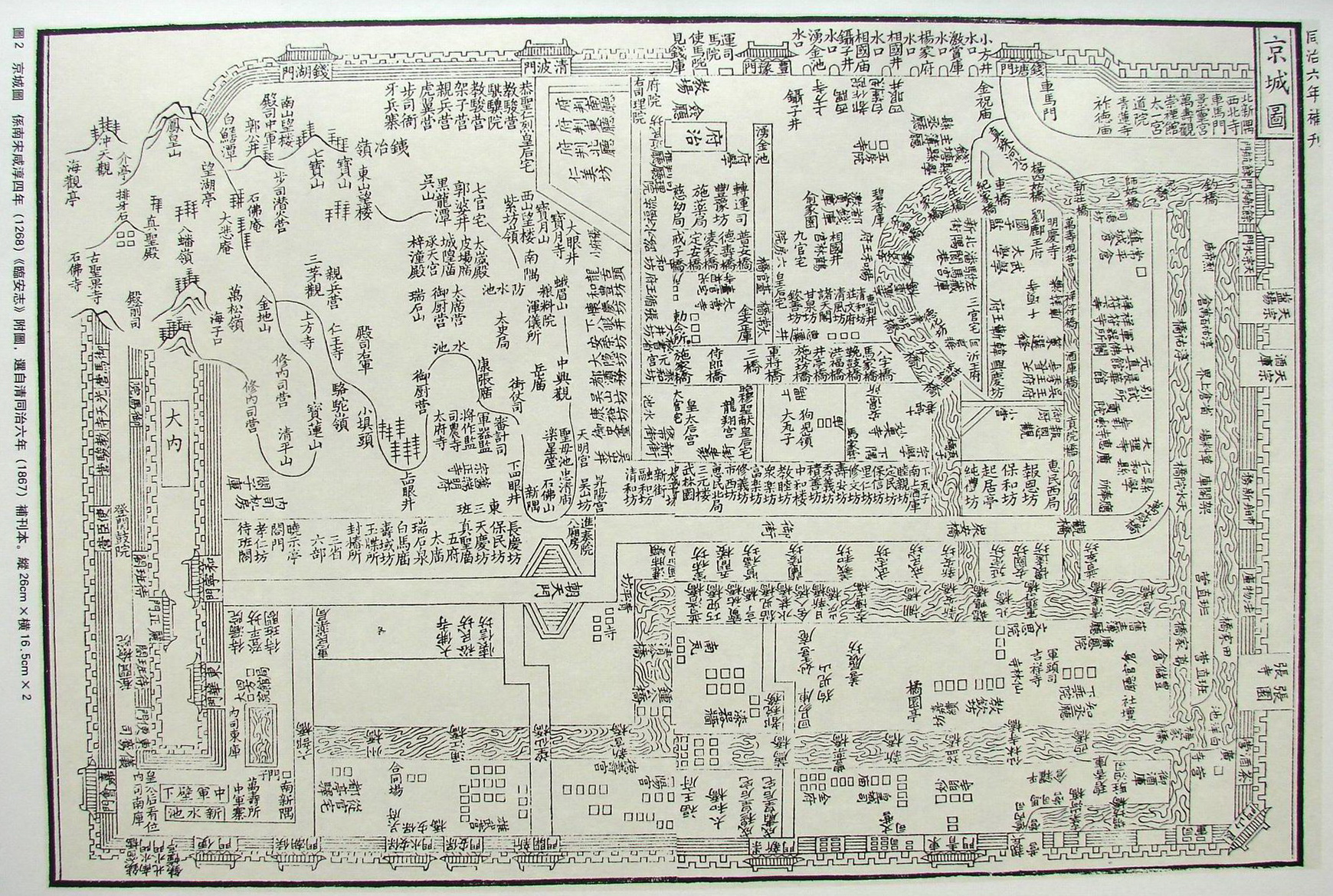 此《京城图》中的京城是指的杭州,此图为南宋咸淳四年(1268)《临安志》附图,选自清同治六年(1867)补刊本。原图大小为26cm×16.5cm。